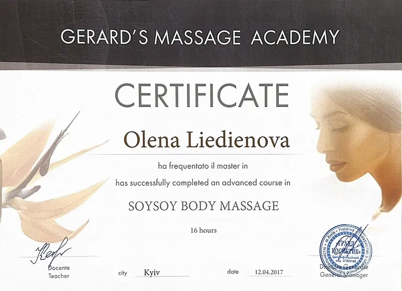SoySoy Body Massage - Olena Liedienova - Certificate